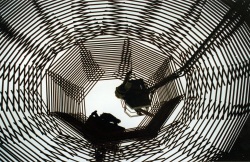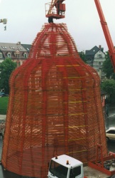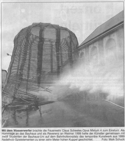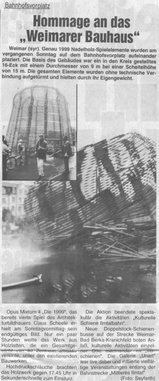 1996 eine Hommage an das Weimarer Bauhaus auf dem Bahnhofsvorplatz Weimar. 1999 Nadelholzleisten (Dachlatten 200x5x3cm) zu einem 16-Eck (Durchmesser: 9m, Höhe: 15m) gestapelt. Gesamtgewicht: 80 Zentner. |
